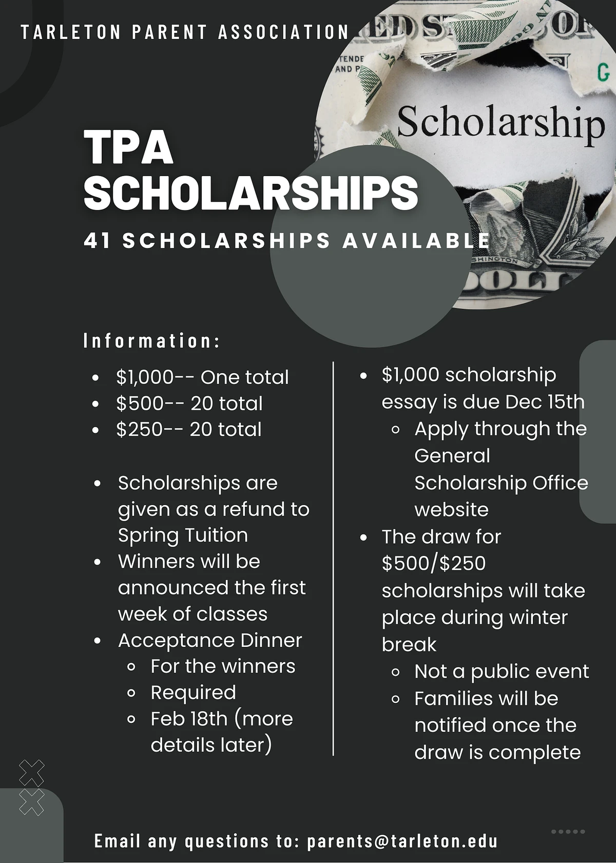 Information on the TPA scholarships and the steps that are taken before the names will be released this coming January! Please reach out if you have any more questions.