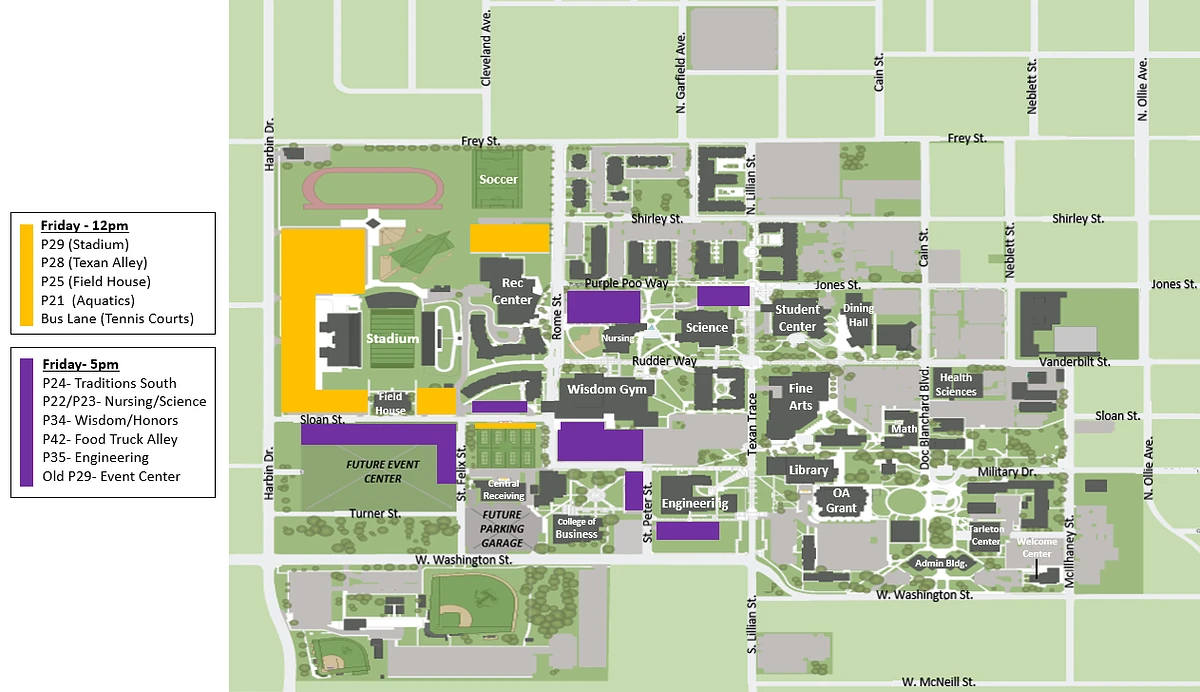 Good afternoon, Texans! Please read thoroughly to learn information about Family Weekend parking and an update in policies regarding lot closures for home football games.