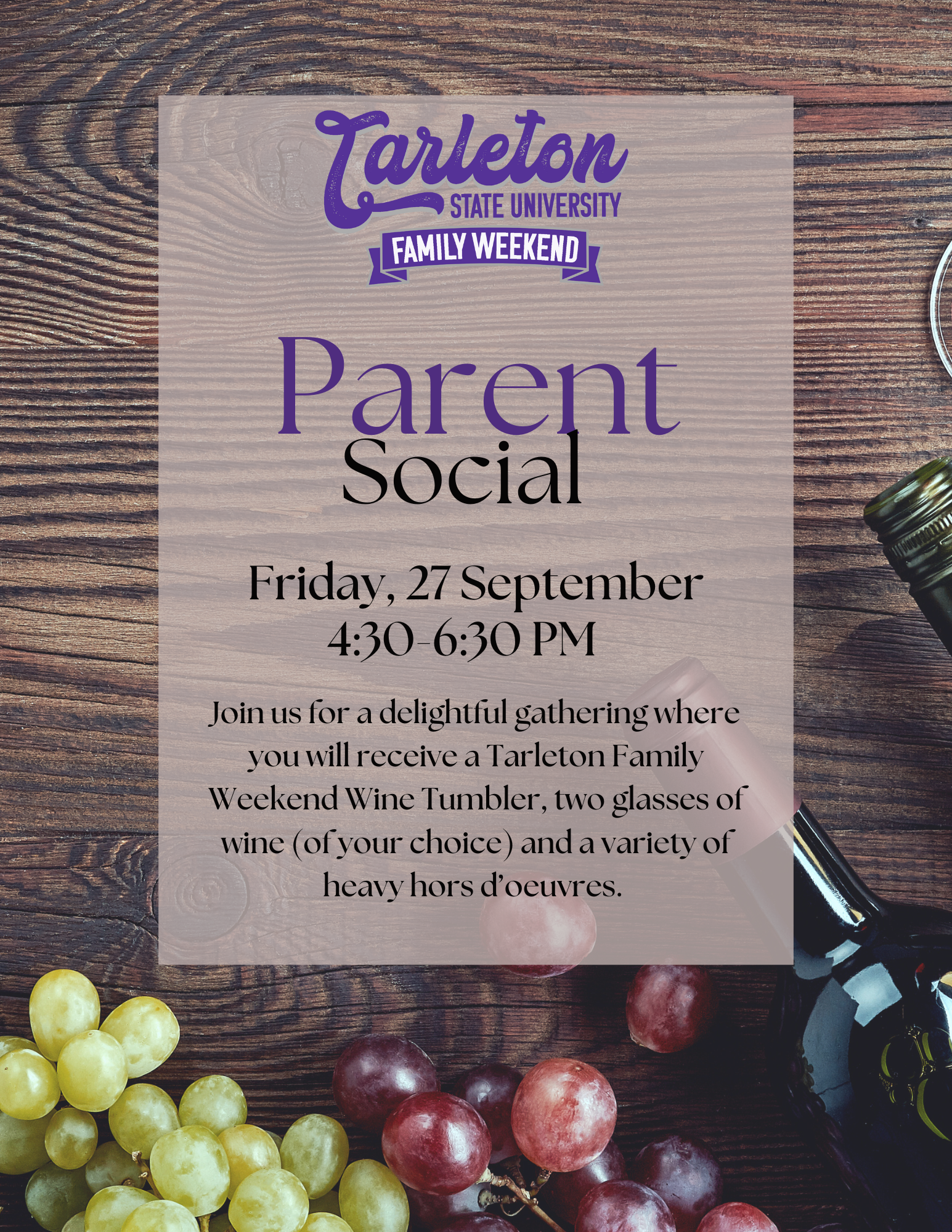 Join us for a delightful evening of conversation and camaraderie at the Tarleton Parent Social! Connect with fellow Tarleton families while enjoying some exquisite wine and delicious hors d'oeuvres.